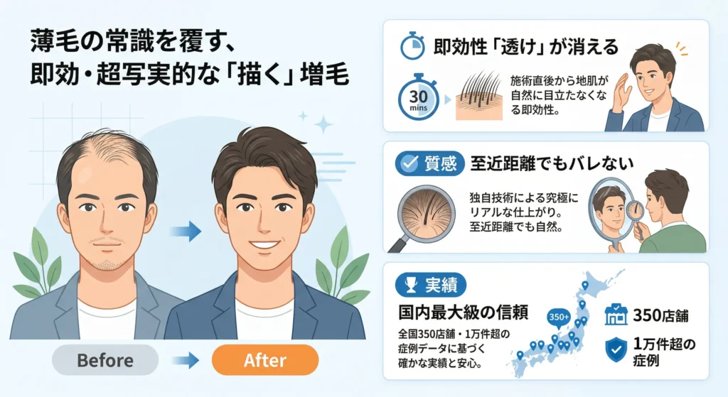 「エレベーターの鏡に映る自分の頭頂部に愕然とした」「強い光の下や、雨・風の日に他人の視線が気になる」。薄毛の悩みは、単に髪が減ること以上の精神的ストレスを伴います。市販の増毛パウダーやスプレーは一時的な凌ぎにはなりますが、汗や水に弱く、常に「落ちていないか」という不安がつきまといます。また、育毛剤やAGA治療は効果が出るまでに半年以上の時間がかかり、必ずしも満足な結果が得られるとは限りません。