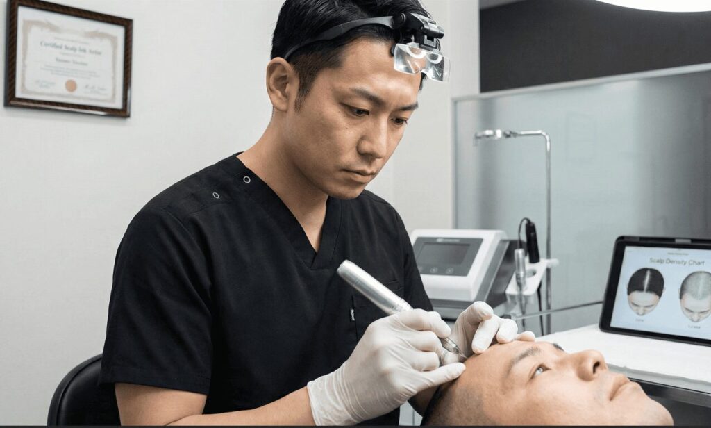 スカルプインクでは、独自のトレーニングと認定制度を通過したアーティストのみが施術を担当します。頭皮タトゥーは、単にドットを入れる作業ではなく、頭皮の状態・毛量・毛流れ・将来的な変化まで考慮した設計力が求められます。そのため、一定期間の技術研修と理論教育を受けたうえで、基準を満たした施術者のみが認定される仕組みが採用されています。これにより、店舗や地域が異なっても、施術品質が大きくブレにくい点が特長です。また、技術アップデートや情報共有も継続的に行われており、過去の手法に依存しない体制が整っています。施術者選びに不安を感じやすい分野だからこそ、制度としての安心感が差別化につながっています。